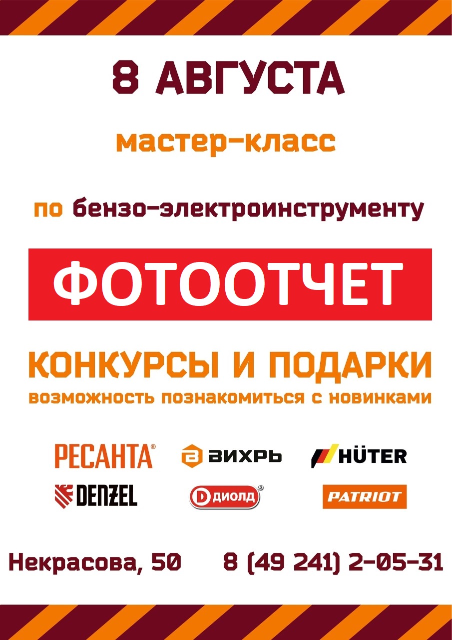 08.08.2024 в преддверии Дня Строителя, на площади у магазина "ОБЪЕКТ" г.Гусь-Хрустальный, состоялось проведение мастер-классов от производителей бензо-электроинструмента.